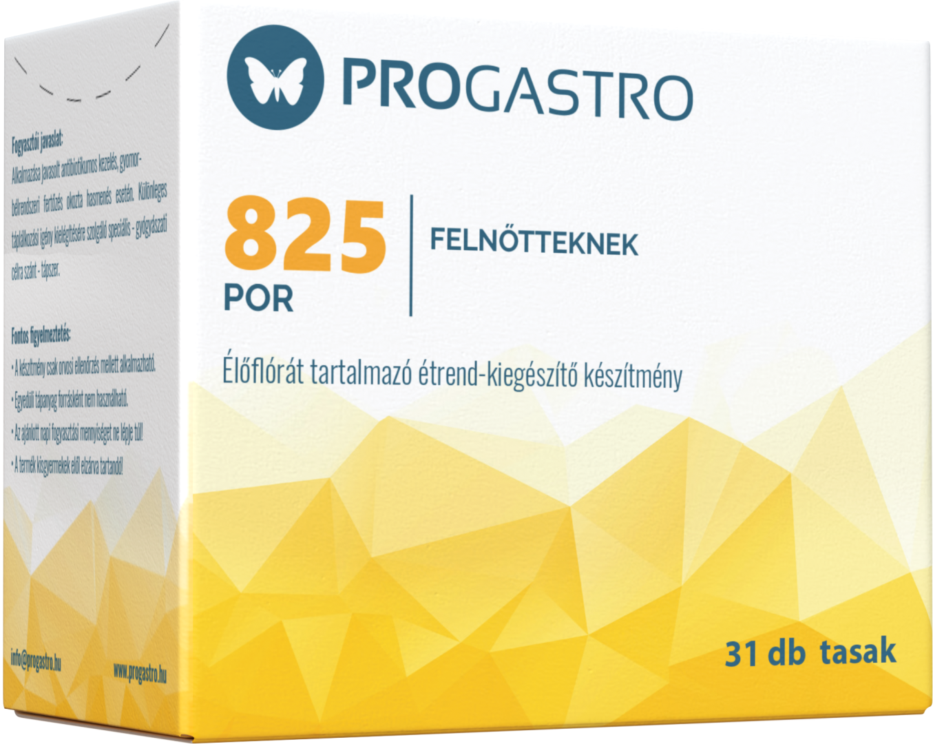 A ProGastro 825 - 9 féle, a bélcsatorna mikroflórájában is megtalálható baktériumtörzset tartalmazó étrend-kiegészítő készítmény felnőtteknek.
